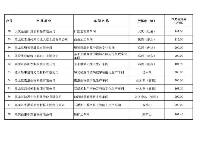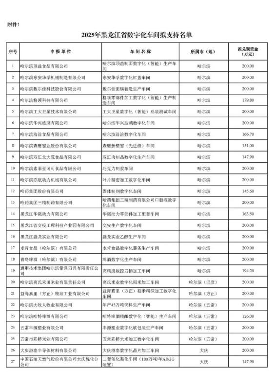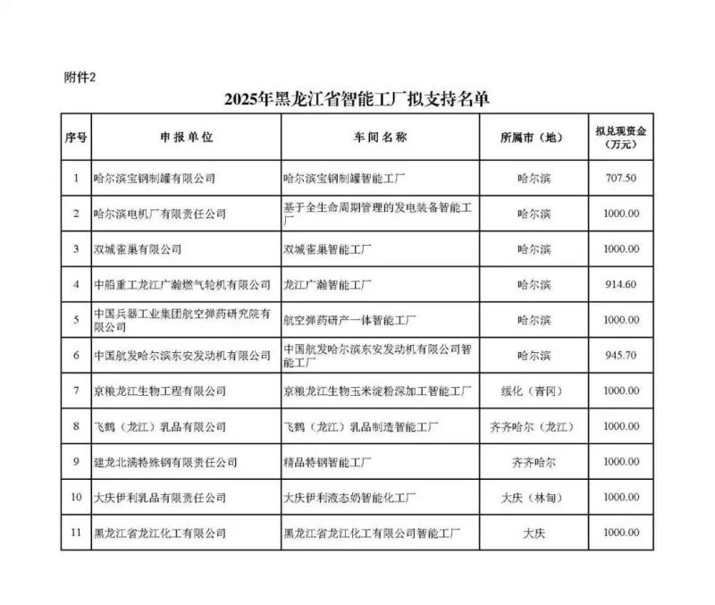 为推动我省产业振兴,落实《黑龙江省推动工业振兴若干政策措施》,按照公开、公平、公正的原则,根据《黑龙江省制造业企业“数字化车间(生产线)及智能工厂”奖励政策实施细则(修订版)》,经省工信厅、省财政厅组织审核,初步确定2025年黑龙江省数字化车间和智能工厂拟支持名单(详见附件),现予以公示,公示期5个工作日(2025年10月14日-10月20日)。欢迎社会各界监督,如有异议,可在公示期内实名反映。