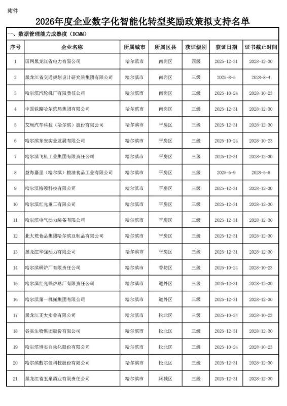 为贯彻落实《新时代龙江创新发展60条》(黑办发〔2023〕19号),依据《黑龙江省支持企业数字化智能化转型奖励政策实施细则》。按照公平、公正、公开的原则,现将符合“企业数字化智能化转型”免申即享类政策条件的拟支持名单予以公示,接受社会各界监督。公示期为2026年1月13日—1月19日(5个工作日)。如有异议,可在公示期内向省工信厅反映。
